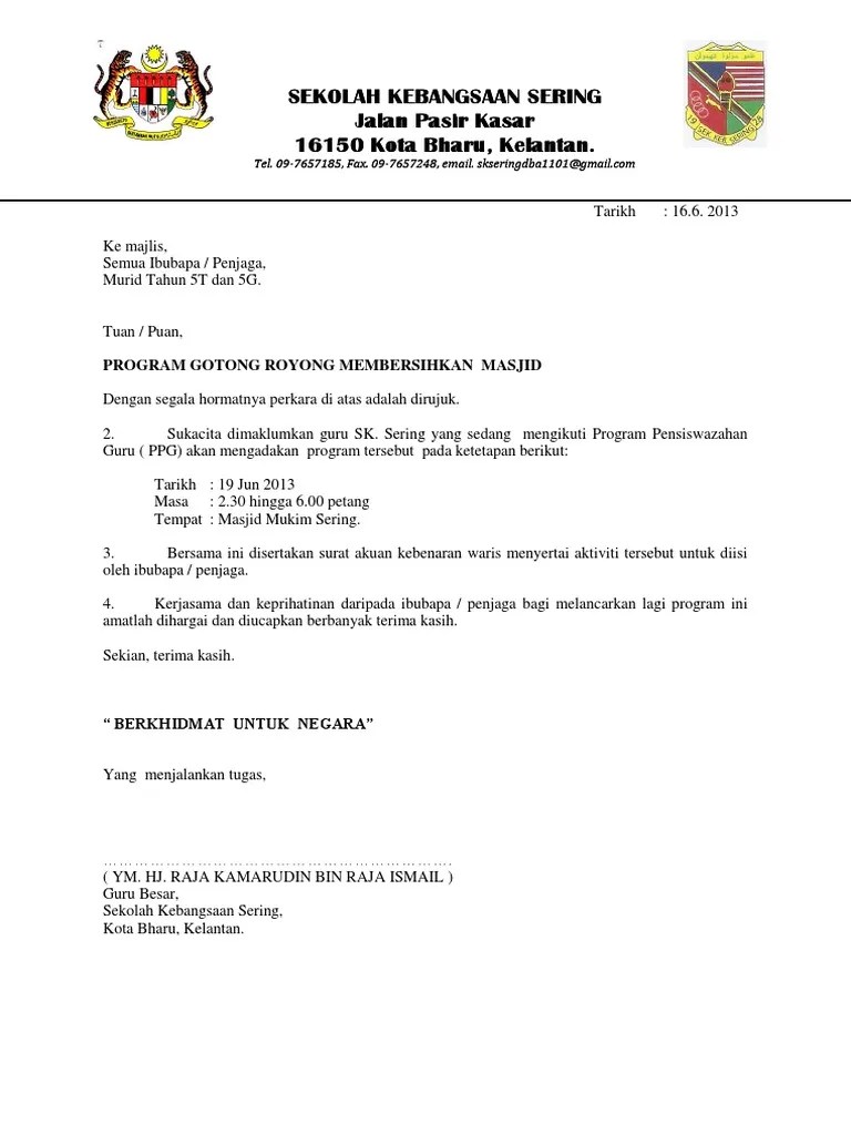Dimaklumkan bahawa jawatankuasa surau kampung charuk bemban dalam, mukim kupang, baling akan mengadakan aktiviti mini gotong royong bagi membersihkan surau . Contoh surat rasmi jemputan gotong royong contoh qos cute766. 149573569 surat jemputan gotong royong doc. Contoh surat jemputan gotong royong. Contoh surat pemberitahuan kegiatan gotong royong | kali ini dikongsikan cara buat surat jemputan penduduk untuk bergotong royong. Persatuanibubapa dan guru sekolah kebangsaan desa petaling, desa petaling,57100kuala lumpur.